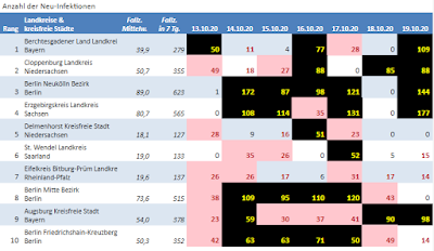 In meiner Tabelle werden dagegen die Fälle verwendet, die in den letzten sieben Tagen an das RKI gemeldet wurden, und das waren eben nur 29 Personen. Dieser Wert wird dann geteilt mit einer Einwohnerzahl, die vom Statistischen Bundesamt veröffentlicht worden ist (und das war zum Stichtag 31.12.2018) und anschließend hochgerechnet auf 100.000 Einwohner. Das Ergebnis ist jedenfalls ein ganz anderes: Link zu der eigenen Tabelle.